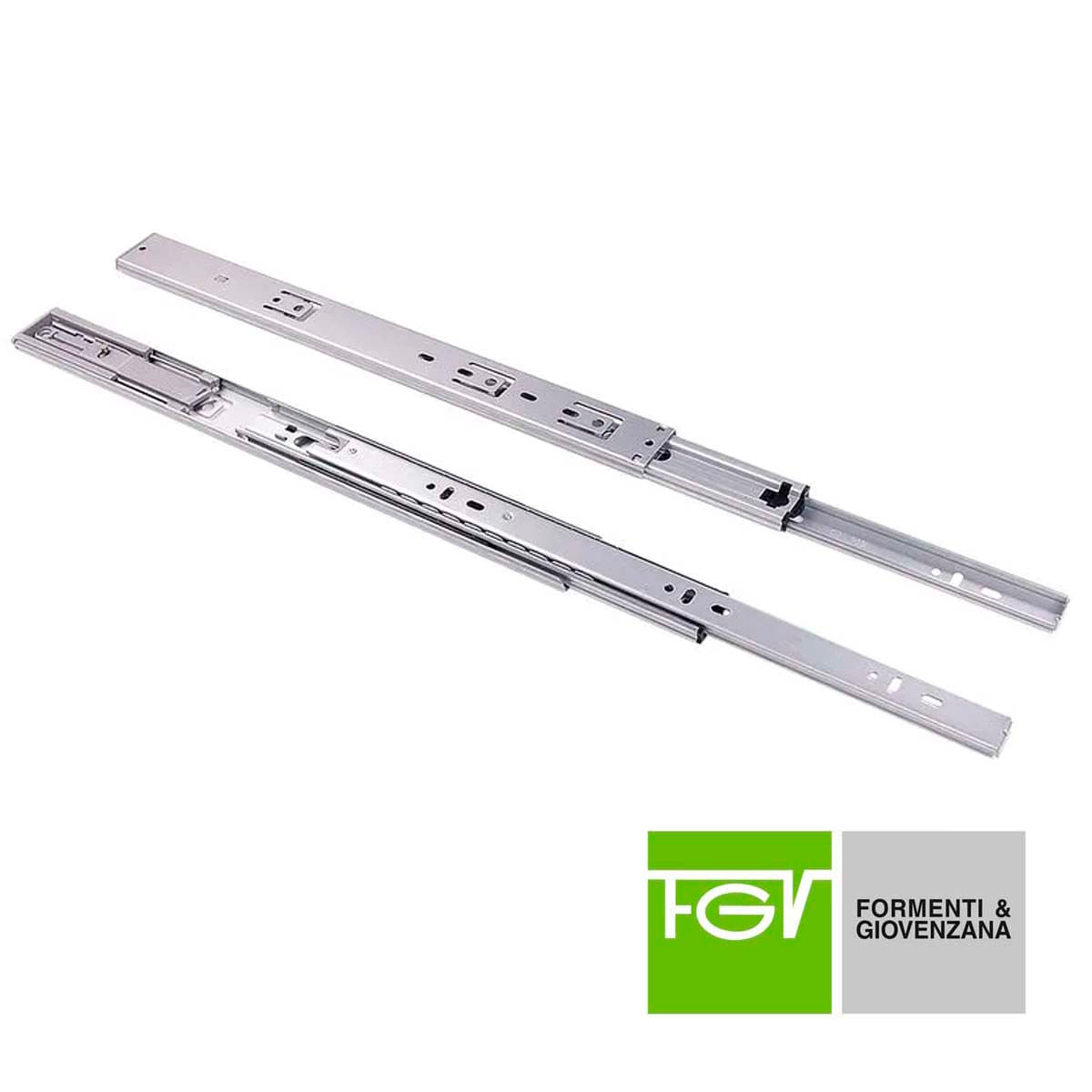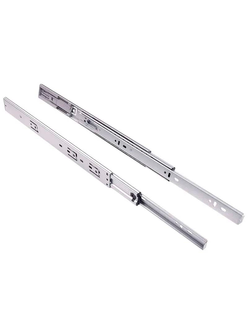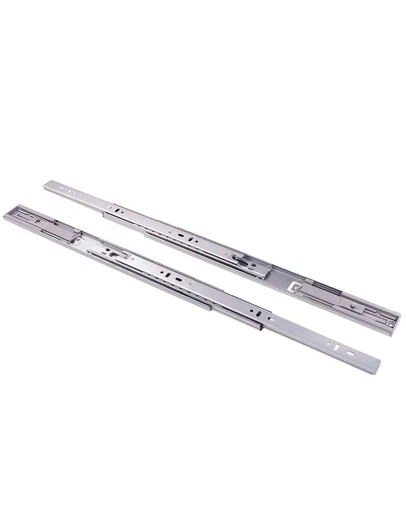 corrediça telescópica com abertura total do comprimento nominal com deslizamento através de esferas de aço e fechamento suave das gavetas, através de molas e pistão. Peça única de montagem lateral autotravante no final do curso aberto e travas no final do curso que permitem a retirada da gaveta.