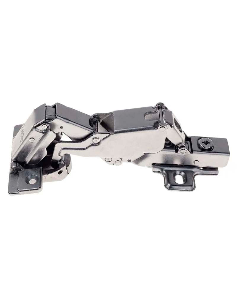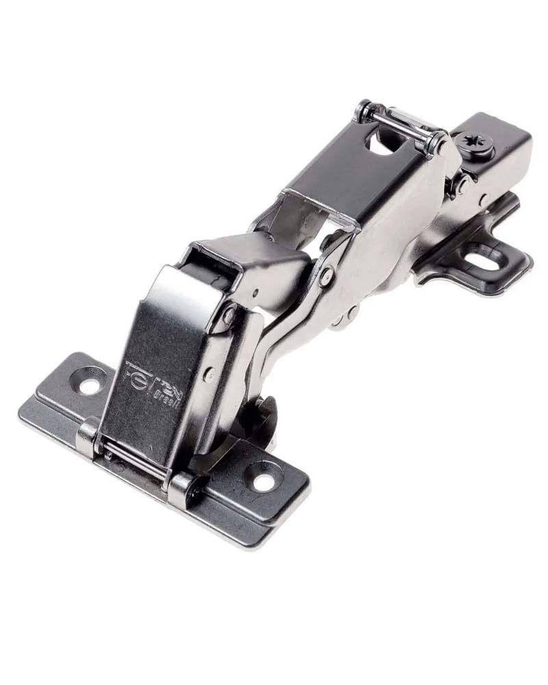 dobradiça fgvtn 165º com montagem rápida e amortecimento integrado para fechamento suave de portas. Sistema de montagem que permite regulagem lateral vertical e horizontal para melhor alinhamento das portas.