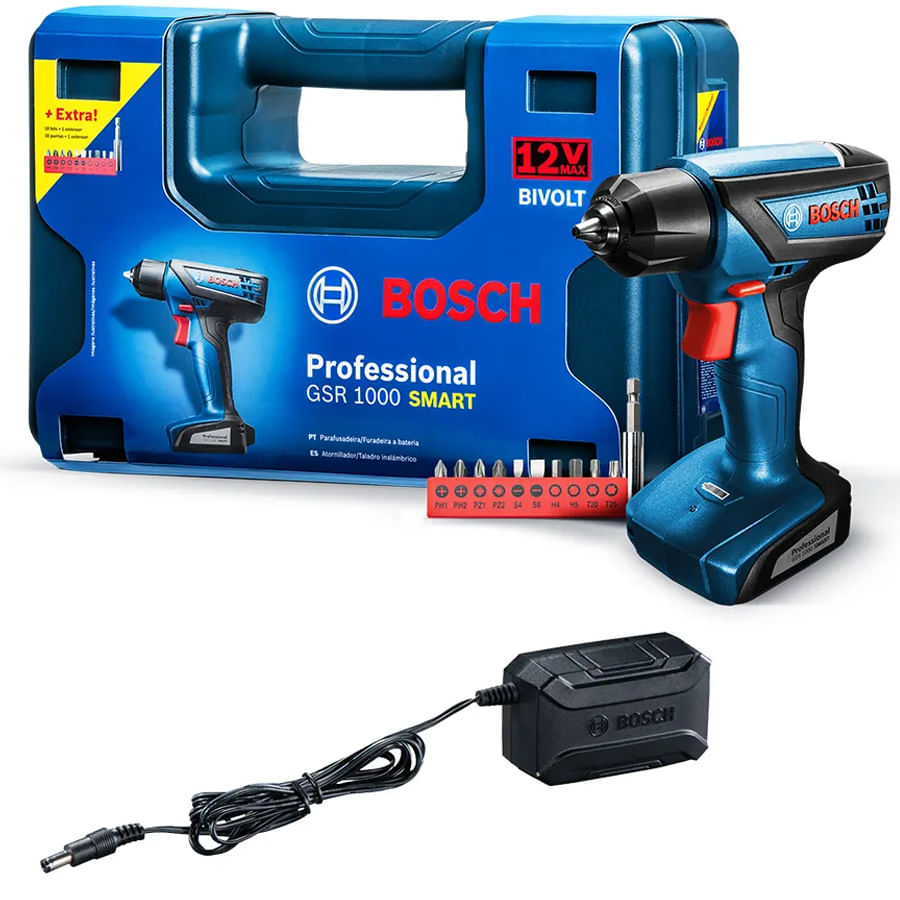 a parafusadeira e furadeira gsr 1000 smart é a mais compacta da categoria, com apenas 0,9 kg, ideal para transportar no dia a dia e trazer mais praticidade. Oferece mais conveniência no trabalho por ter carregador rápido bivolt que carrega a ferramenta em até 1 hora. A parafusadeira e furadeira gsr 1000 smart possui fácil controle de velocidade, luz de led que ilumina ambientes mais escuros e indicador eficiente de nível de bateria. Além disso, vem com punho emborrachado e ergonômico que reduz a fadiga do operador ao final do dia. Realiza até 600 parafusamentos por carga em madeira macia (testes realizados com parafusos ø3,5 x 35 mm). O seu mandril de aperto rápido possibilita mais praticidade e rapidez na troca dos acessórios. Indicada para aplicação leve em madeira com perfuração de até 10mm e em aço até 6mm. Possui até 700 rotações por minuto e diâmetro máximo de 6mm para parafusos. A parafusadeira gsr 1000 smart acompanha carregador, manual, maleta plástica, 10 bits e 1 extensor universal.